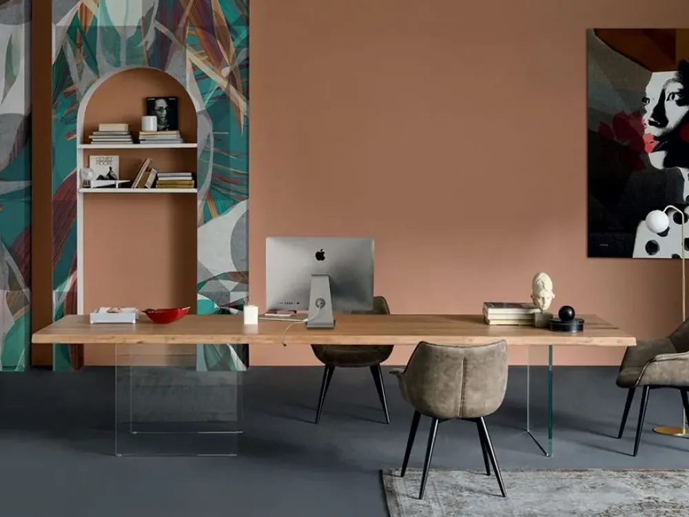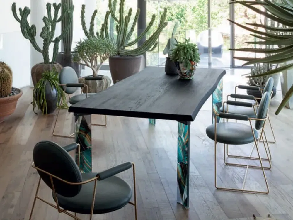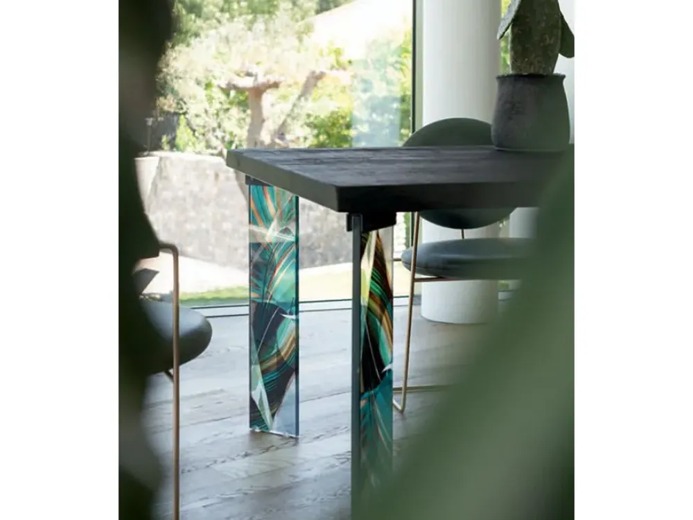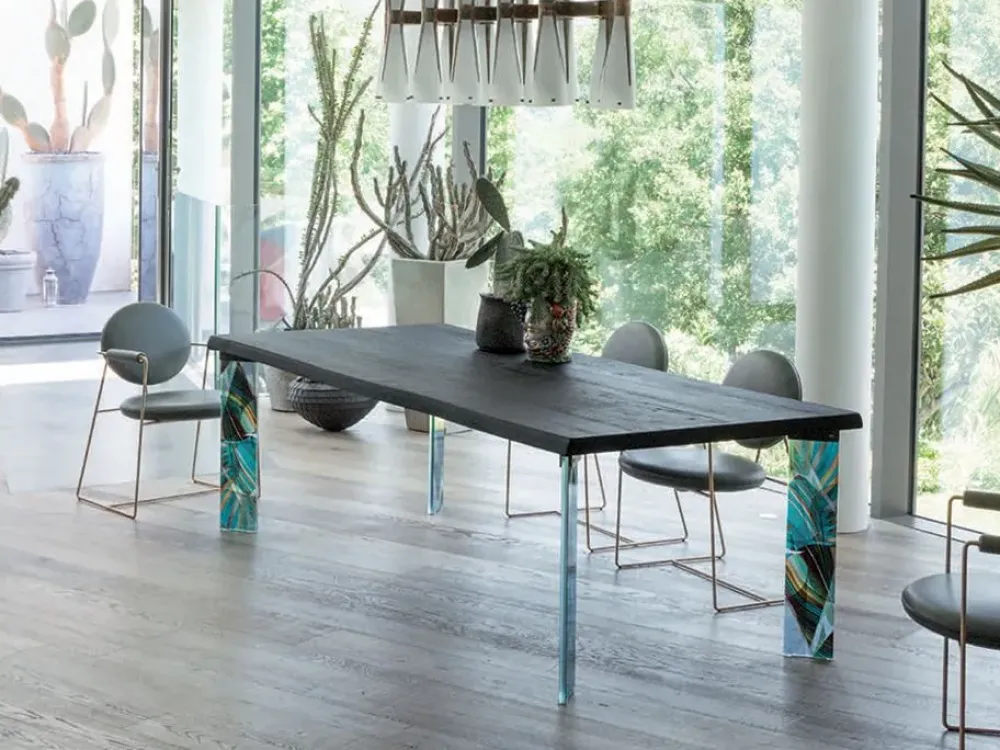 Il tavolo con i piedi in vetro serigrafata, San Francisco di Devina Nais si distingue sua personalità nei disegni riportati. Il piano realizzato in legno massello di rovere, nello spessore di 5,4 cm e per inconsueto bordo corteccia frutto dalla lavorazione del tronco. San Francisco è il tavolo che risulto unico nel suo genere diventato ogni piano diverso uno e mettendo in evidenza la lavorazioni artigianale. Sono disponibili diverse basi e materiali. Numerose sono le tipologie di gambe, disponibili in tre materiali pregiati. Finiture legno naturale, laccato opaco piedi vetro, metallo, legno Dimensioni altezza 75 cm spessore piano 5,4 cm legno 180 larghezza 180 cm e profondità 00 cm 200 larghezza 200 cm e profondità 100 cm 220 larghezza 220 cm e profondità 100 cm 250 larghezza 250 cm e profondità 110 cm 300 larghezza 300 cm e profondità 110 cm opzione allunga per lato 50 cm spessore 3,5 cm legno il prezzo si riferisce al tavolo da 180 cm x 90 cm gambe Line vetro Trasparente
