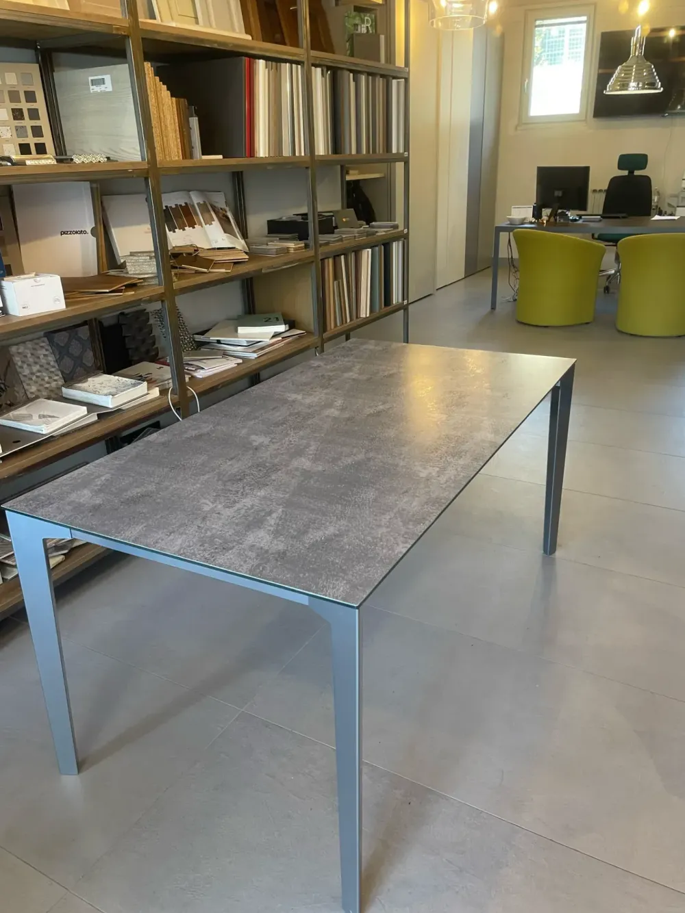 Vetrigo è un tavolo con struttura in metallo similcromo e piano in vetro ceramicato oxide cemento. Le particolarità del vetro temperato ceramicato che lo distinguono sono : durezza e longevità; è antimacchia, antigraffio, antimuffa, idrorepellente, resistente ai fattori chimici, resistente ai solventi e allo strappo.