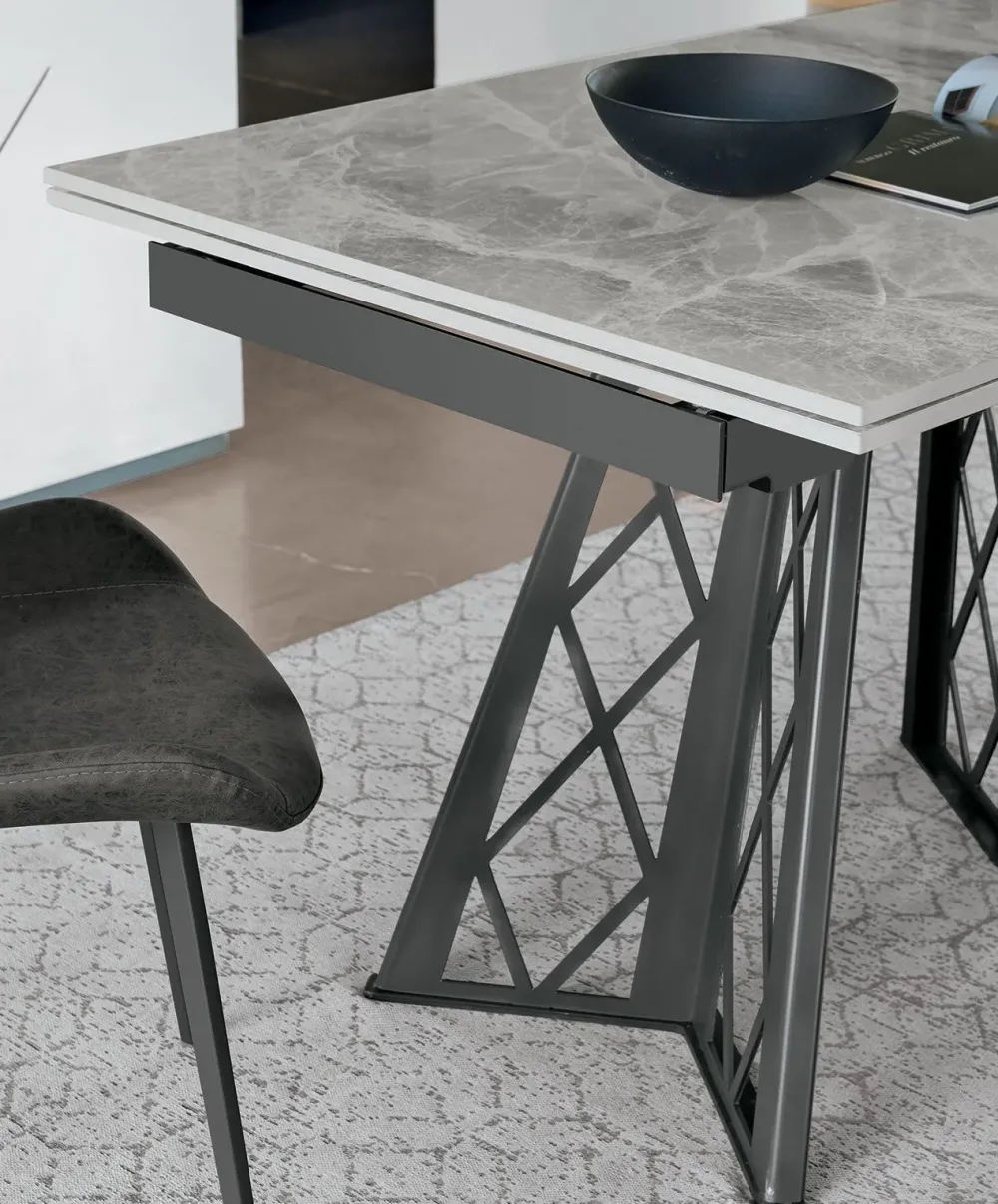 Piano rettangolare e allunghe laterali in gres porcellanato effetto marmo.