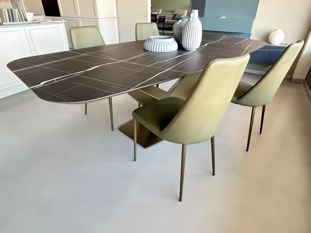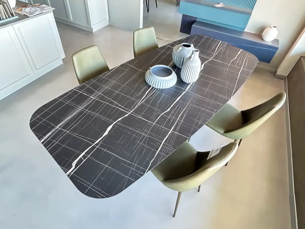 Elegante e scenografico, questo tavolo si distingue per il piano in HPL effetto marmo scuro, attraversato da venature chiare che donano dinamismo e raffinatezza. Le forme morbide e gli angoli arrotondati valorizzano il design, rendendolo ideale per ambienti contemporanei dove stile e funzionalità si incontrano. Perfetto per chi cerca un elemento d arredo solido, pratico e di grande impatto visivo, arricchito da un dettaglio capace di fare la differenza.