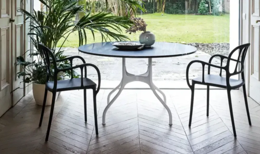Magis Tavolo rotondo Milà struttura bianco piano in marmo nero marquina; Materiali: struttura in tubo di acciaio verniciato poliestere. Giunto in pressofusione di alluminio verniciato poliestere. Piano Diametro 130 cm.