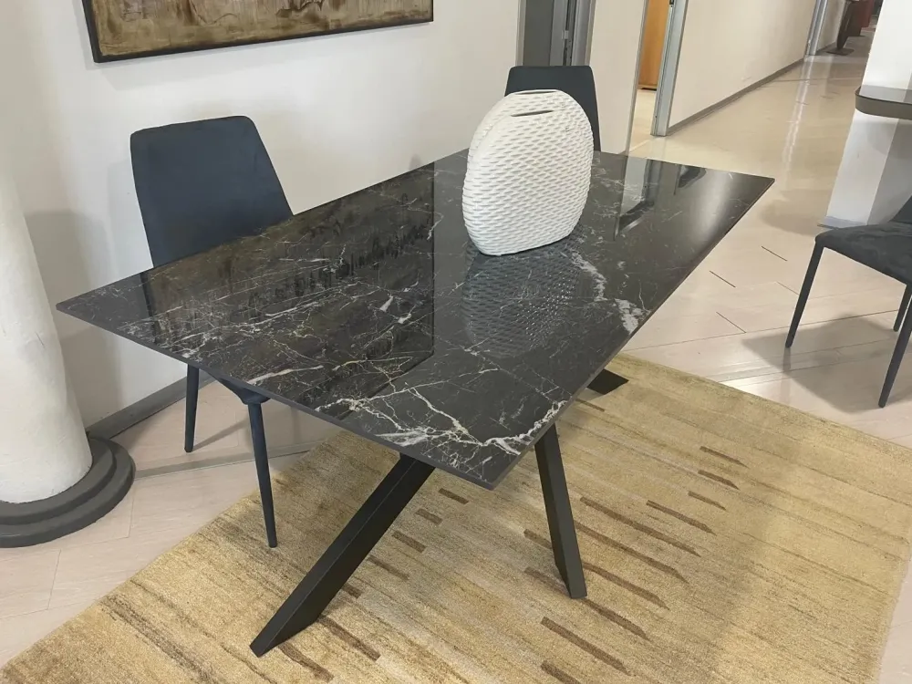 Tavolo rettangolare allungabile con gamba centralead incrocio, in mteallo nera. Piano in gres effetto marmo lucido.