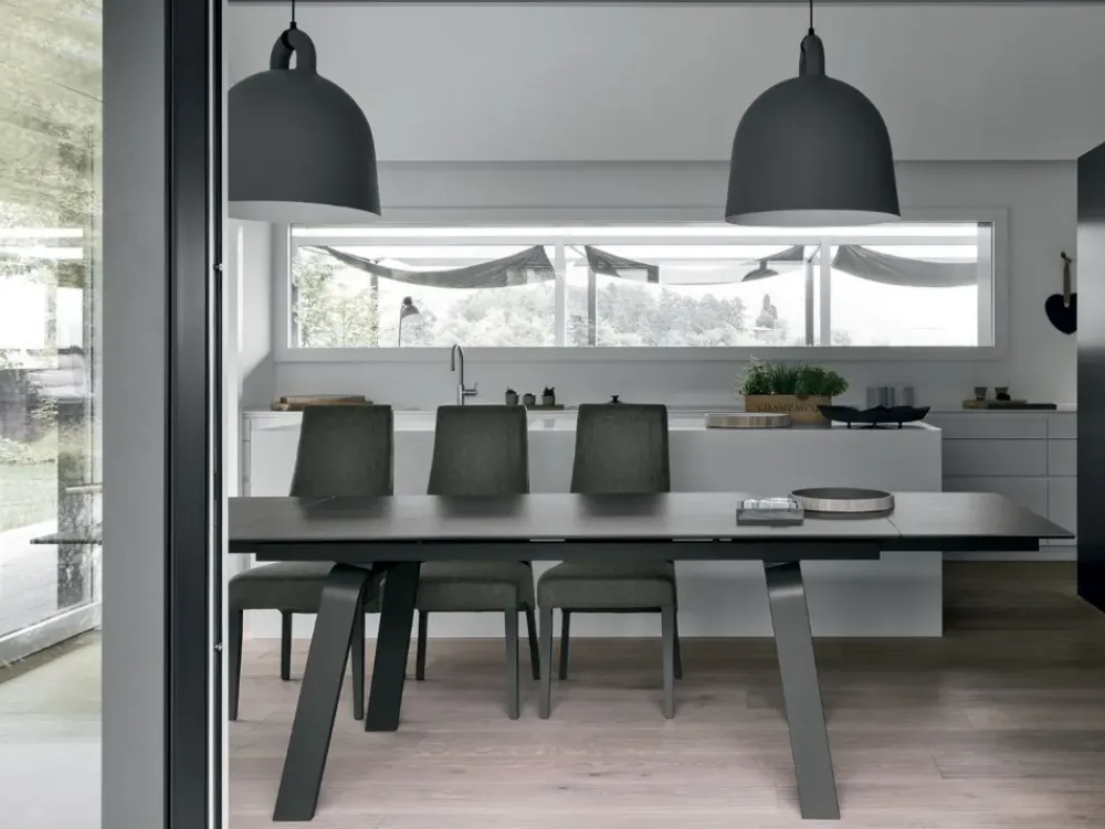 Tavolo allungabile in metallo con gambe in metallo verniciato, piano ed allunghe laterali in gres porcellanato o vetro temperato.