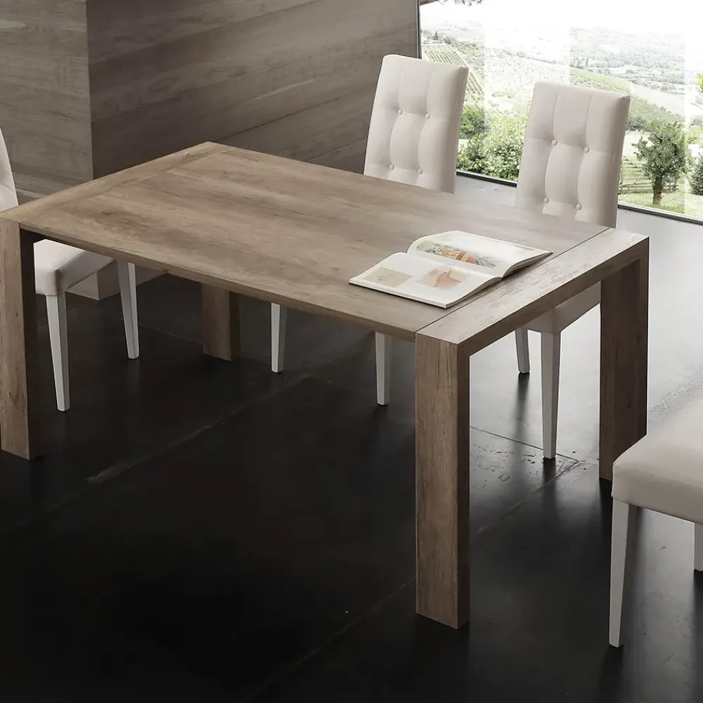 Moderno di La Seggiola è un tavolo allungabile con piano in nobilitato e gambe in legno mdf in tinta. Il piano è disponibile nelle versionibianco poro aperto, rovere nodato e rovere gessato.