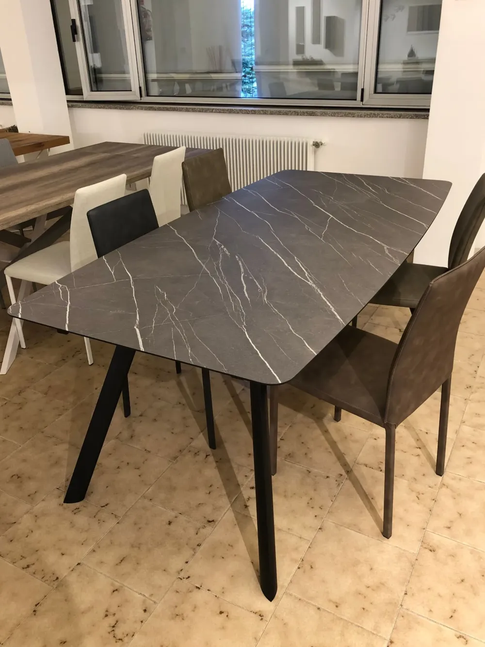 Gambe in finitura antracite e piano a botte in HPL stratificato nella finitura Pietra Tobacco.