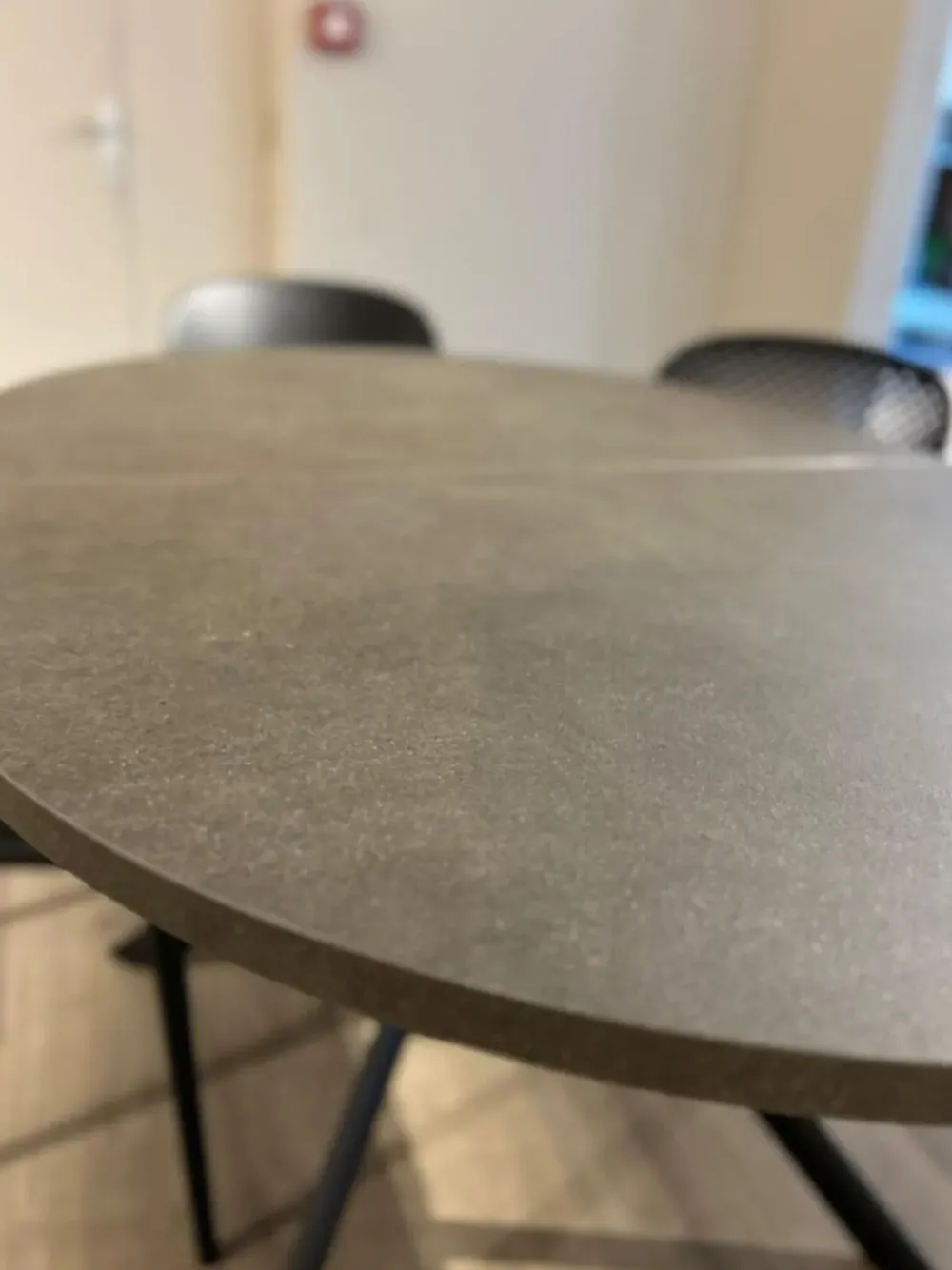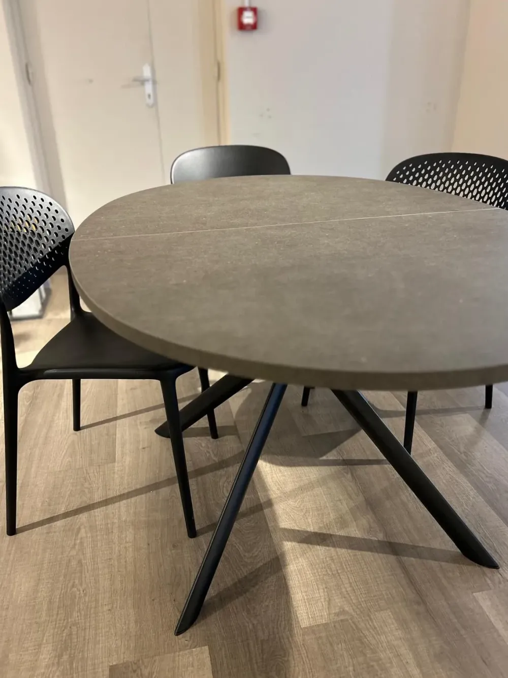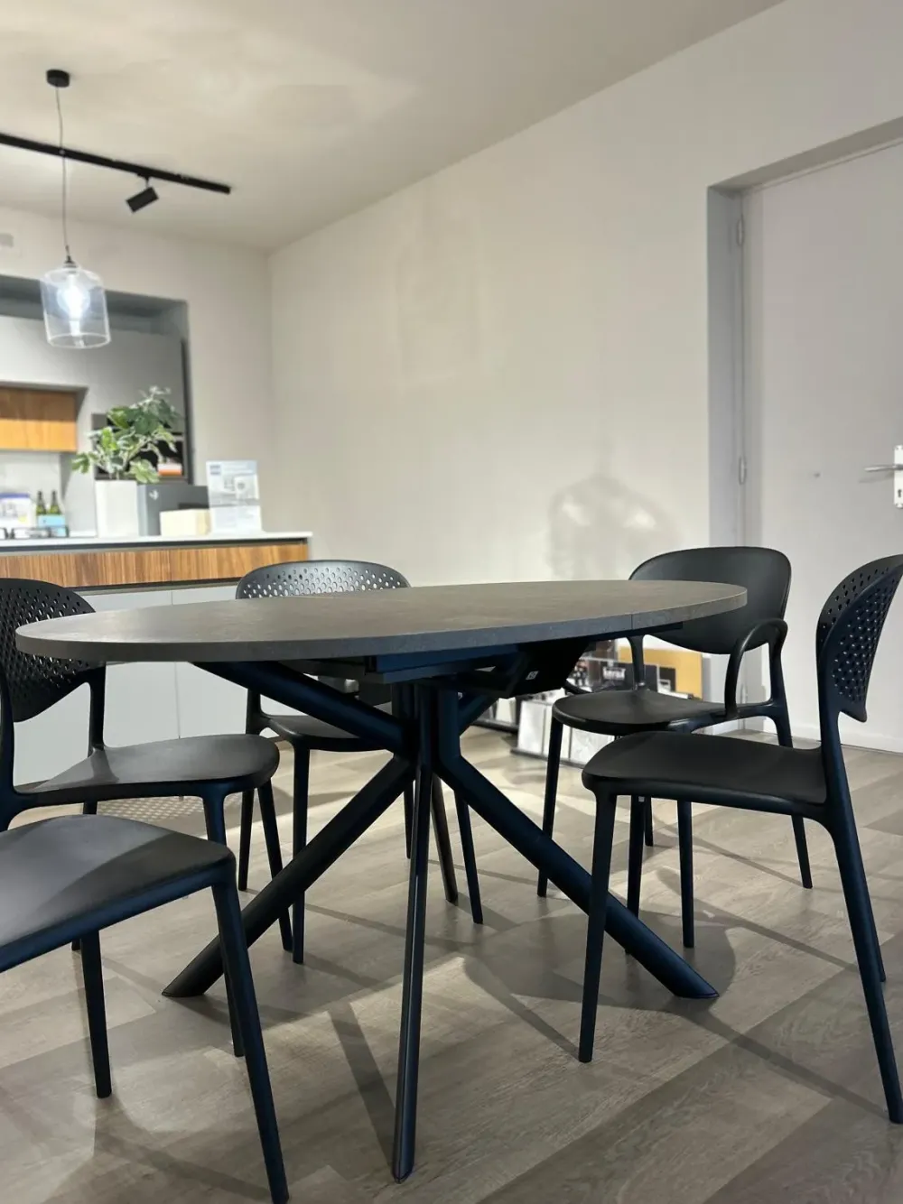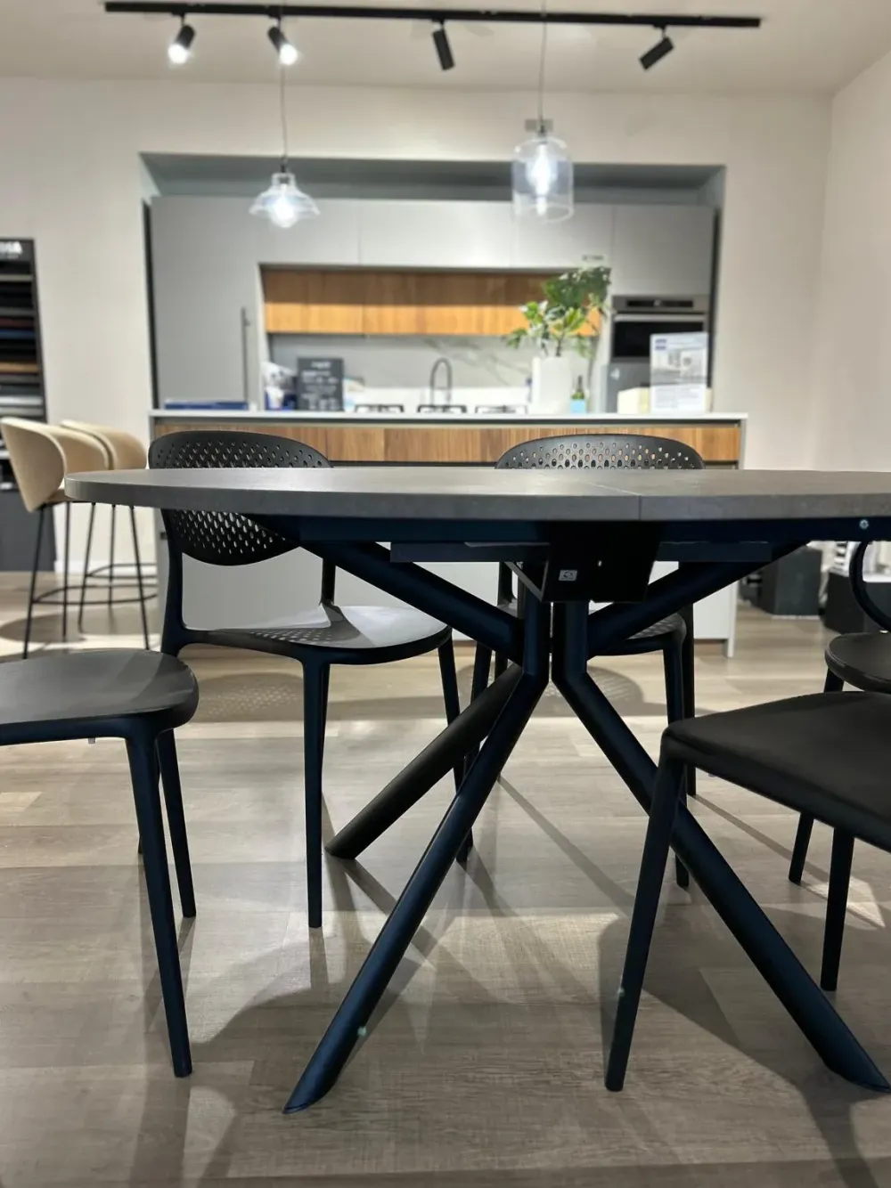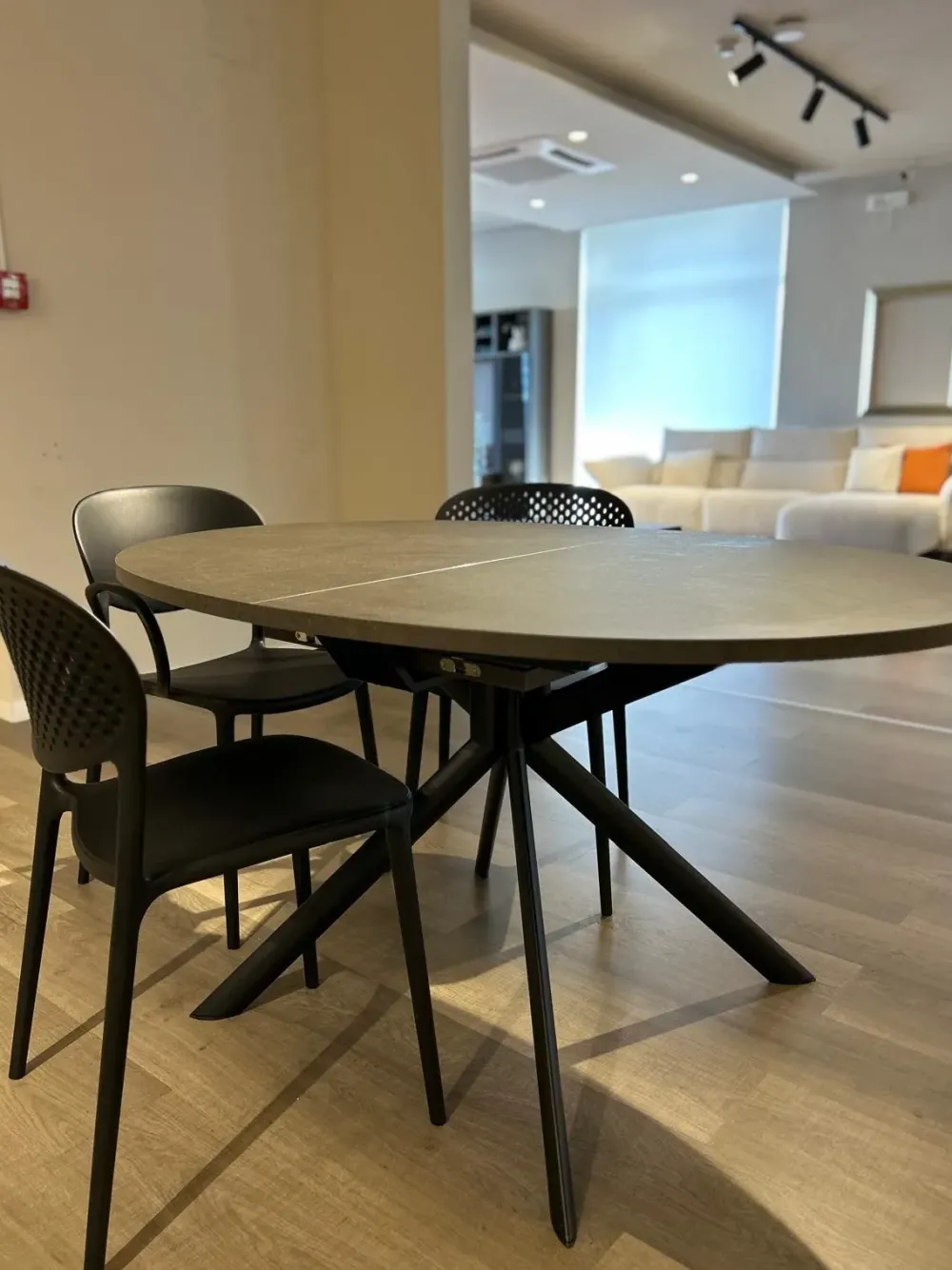 Tavolo allungabile GIOVE, basamento in metallo con piano tondo in legno, legno-ceramica o legno-vetro. Base centrale in metallo fissa con quattro gambe inclinate a sezione ellittica e meccanismo di apertura a libro con allunga centrale in tinta con la base. Le linee semplici e decise lo rendono adatto ad ogni spazio abitativo.