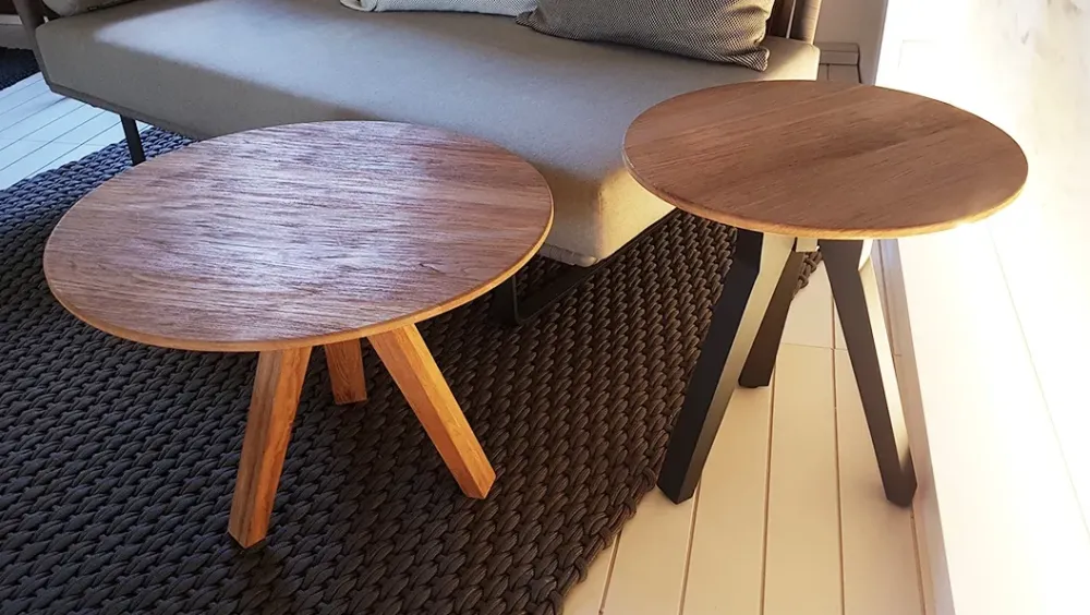 Il tavolino di Kettal è realizzato con piano in teak diametro 48 cm, gambe in legno laccato manganese H.50 cm.