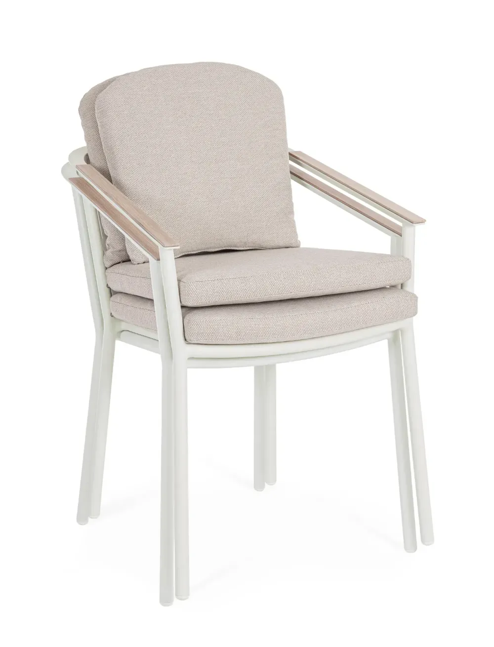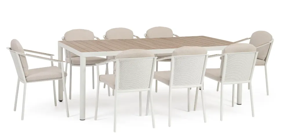 STRUTTURA IN ALLUMINIO VERNICIATO A POLVERE (POLIESTERE). BRACCIOLI SEDIA E PIANO TAVOLO IN ALLUMINIO CON VERNICIATURA EFFETTO LEGNO. CUSCINI SEDUTA E SCHIENALE SFODERABILI CON TESSUTO IDROREPELLENTE OLEFIN (100% POLIPROPILENE). PIEDINI REGOLABILI. GAMBE TAVOLO (VITERIA IN ACCIAIO INOSSIDABILE) DA ASSEMBLARE. SEDIA IMPILABILE.
