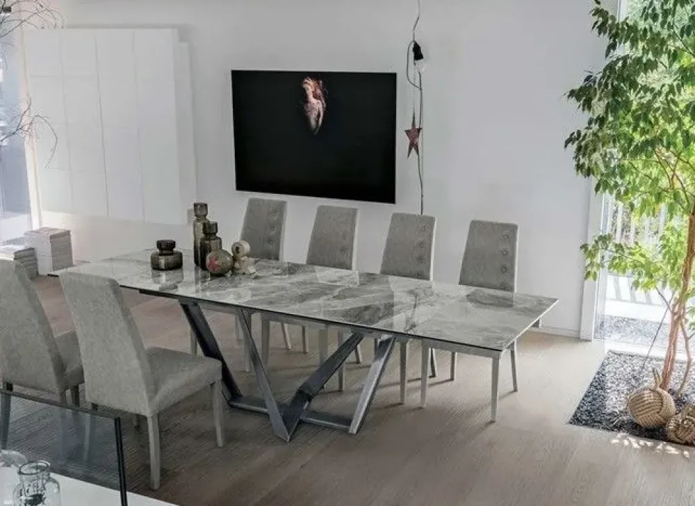 - L’offerta è per un tavolo di cm 90×160/240 con piano in gres Calacatta opaco o Arabescato lucido.