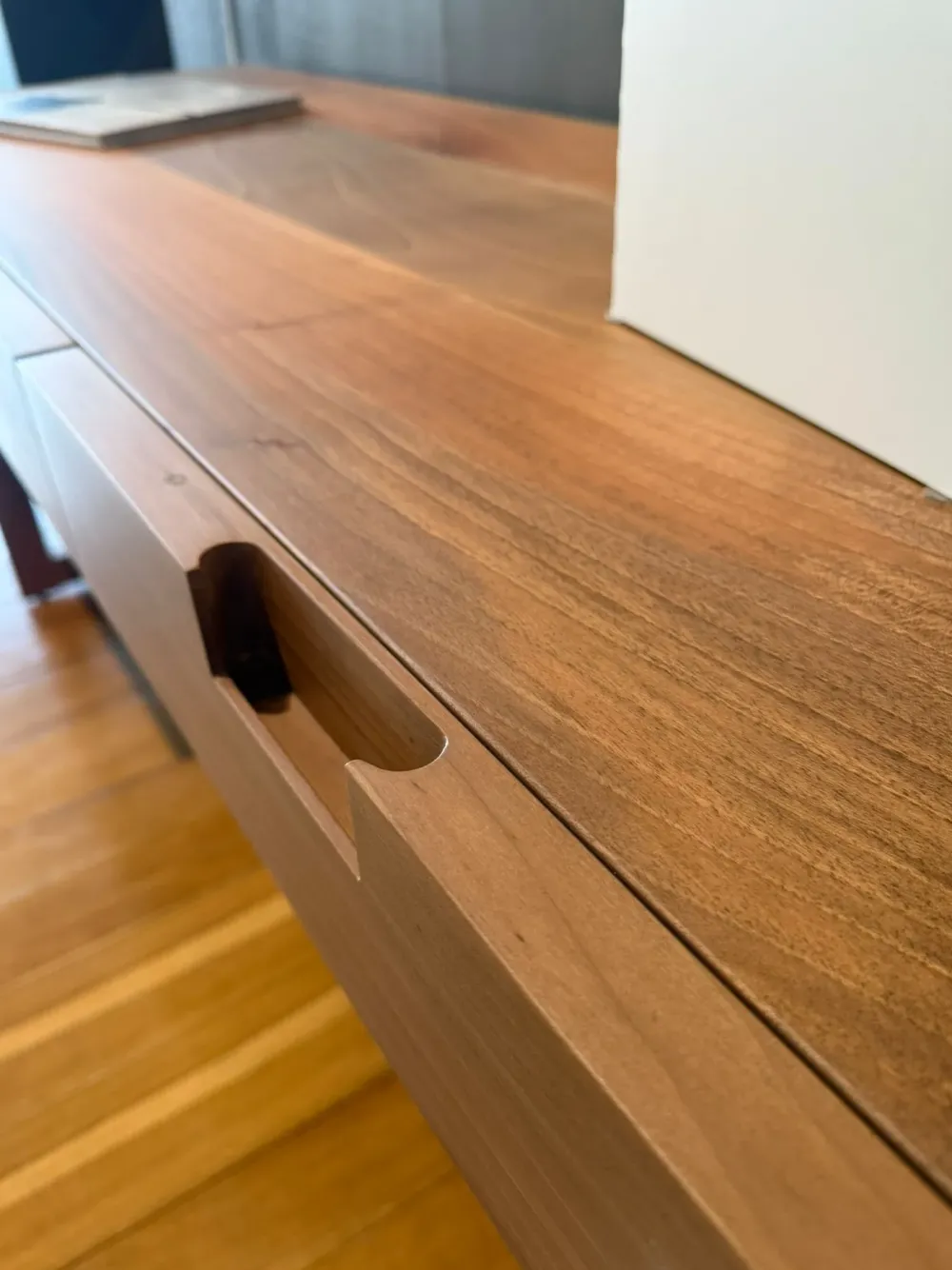 cassetti con guide rallentate, maniglia incassata nel frontale in noce