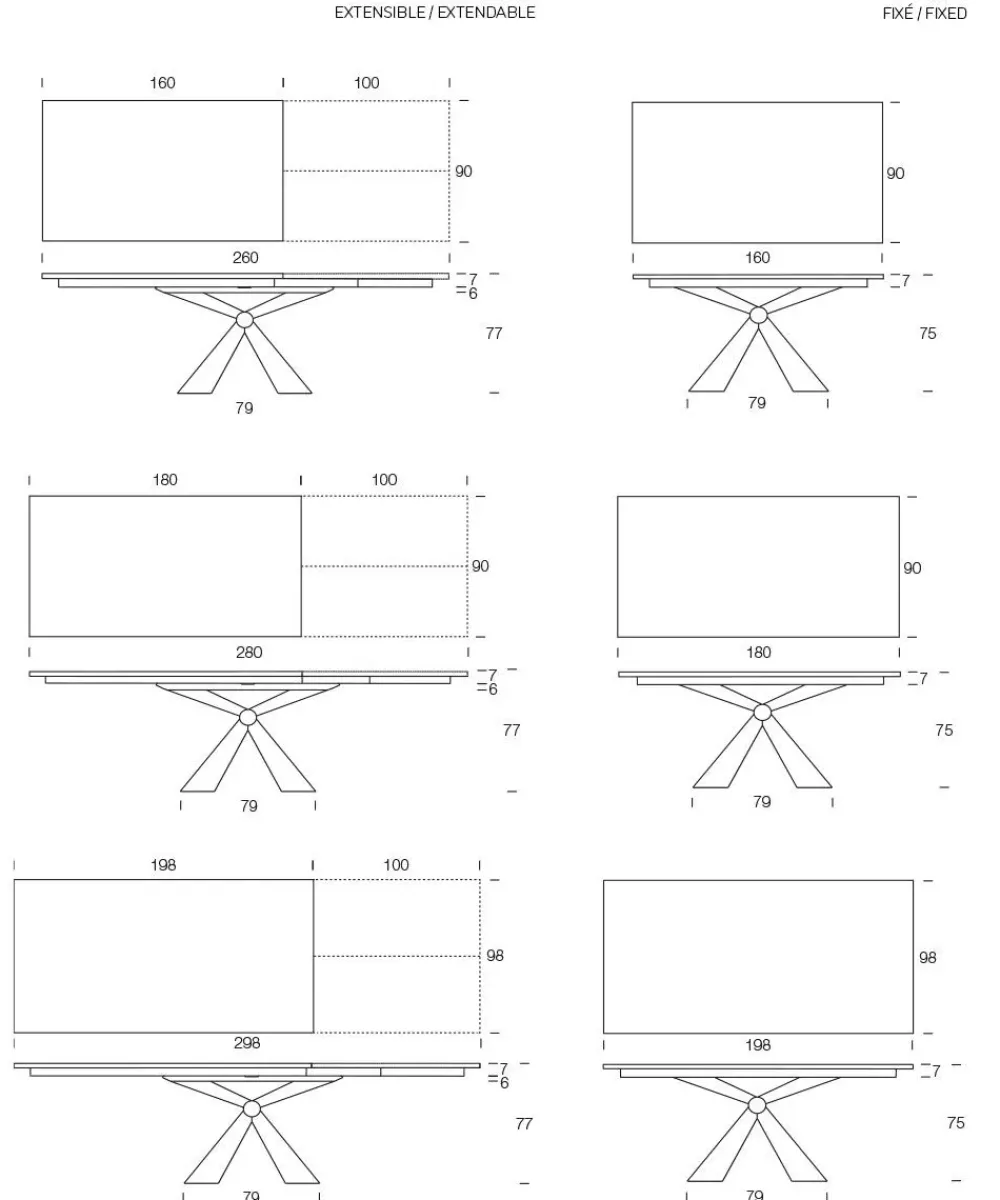 Tavolo da pranzo, struttura allungabile in metallo, meccanismo telescopico, piano in ceramica o in nobilitato, prolunga interna a libro.