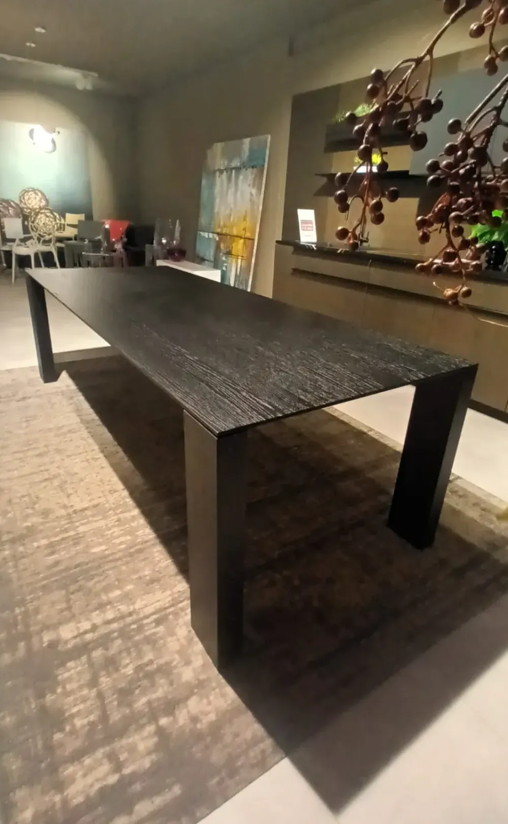 Tavolo fisso con 4 gambe regolari. Struttura in legno finitura Rovere nero corvino. Misure: L 250×100 x H 74 cm.
