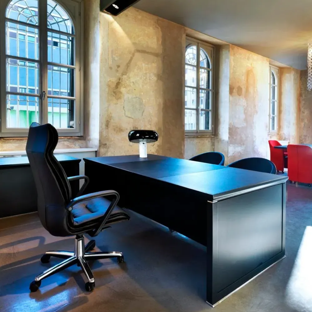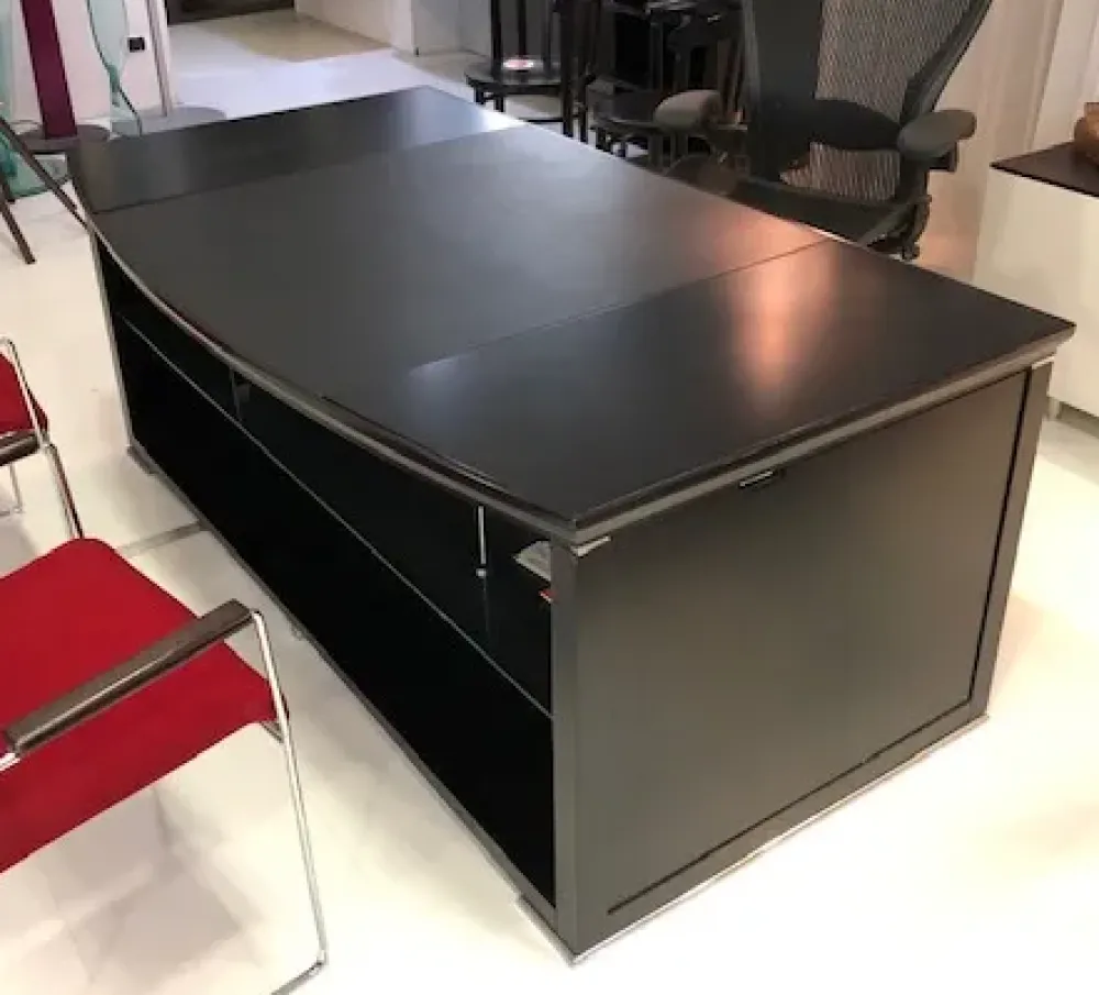 Scrivania direzionale Tecno modello Ianus in laccato nero e parte centrale in pelle colore nero con pannelli laterali asportabili