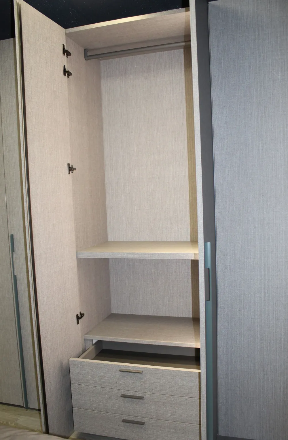 Attrezzatura interna: cassettiera 3 cassetti, porta scarpe estraibile, 3 ripiani legno, tubi appendiabiti. 3 luci Led incassate su fianchi armadio, illuminazione Led dietro specchiera