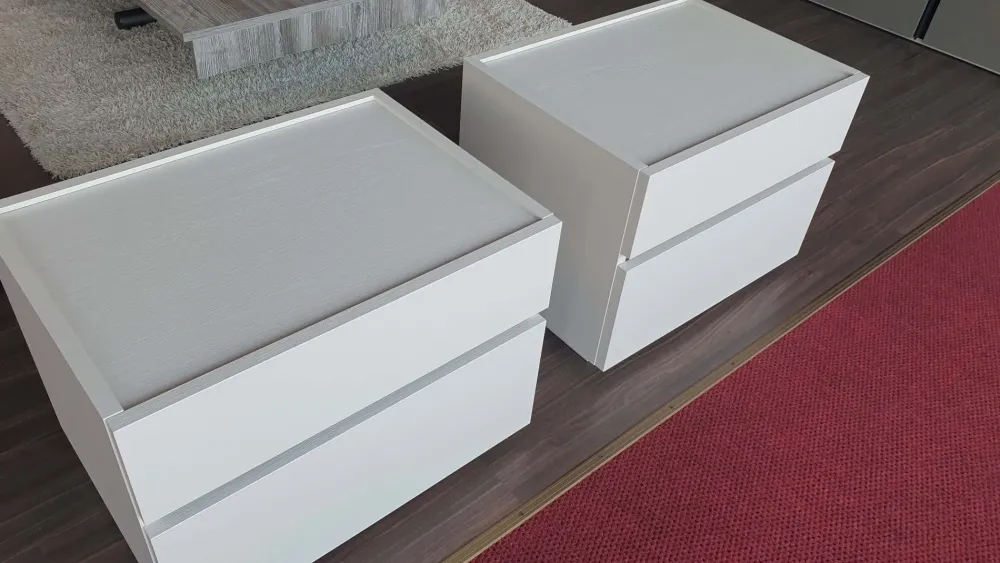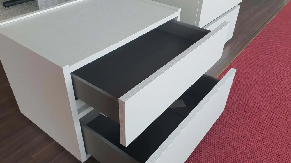 La chiusura dei cassetti è rallentata e l’ingombro totale del comodino è di cm. 60x44prof.x45h.