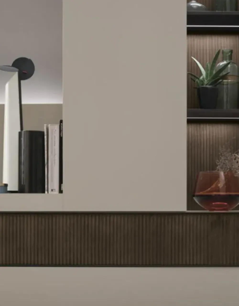 Finiture della composizione: Legno rovere moka canettè, Materico opaco arena, Metallo antracite n. 160.