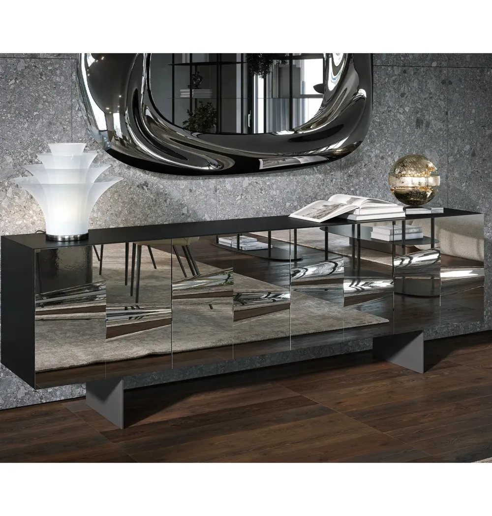 Madia con struttura Laccata Nero opaco,,realizzata con ante a Specchio nelle versioni: Fumè o Bronzo,le ante vengono caratterizzate dalla piegatura del vetro fuso che permettono a ciascuna delle ante,di potersi avvolgere vicendevolmente tra di loro. E’ un modello molto esclusivo di madia,che permette la sua ambientazione in qualsiasi contesto d’arredo,quale elemento neutro ed indipendente. Le sue dimensioni esterne d’ingombro sono di: cm.240 lunghezza x cm.45 profondità x cm.78 altezza. Viene proposta nella soluzione in promo,con lo sconto del 35%. Il prezzo-promo è compreso del trasporto e del montaggio,in tutte le Regioni d’Italia. Per qualsiasi informazione,potete contattarci,attraverso il nostro indirizzo di posta elettronica.