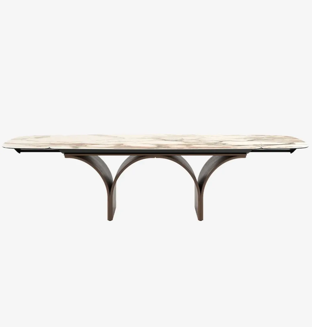 Tavolo da pranzo allungabile,con base in legno termocurvato ispirato al motivo ad arco,disponibile nella versione in Noce canaletto o in Frassino Nero. Il piano viene realizzato in Ceramica effetto marmo nelle diverse finiture a scelta del campionario: Travertino Bianco,Travertino Beige,Travertino Silver,Alaska White,Orobico chic,Tundra,Statuario altissimo,Macchiavecchia Lucido e opaco,Onice grigio,Emperador,Terra liquida,Saphiri noir lucido e opaco,Noisette,Choco,Calcutta vena vecchia,Taj mahal. Le sue dimensioni d’ingombro sono di: cm.200 lunghezza x cm.120 profondità x cm.77 altezza. è completo di una coppia di prolunghe laterali da cm.43 ciascuna(cm.286 lunghezza con allunghe aperte). E’ un modello di tavolo da pranzo,che può facilmente integrarsi in qualsiasi contesto d’arredo,anche di gusto antico,come elemento neutro ed indipendente d’arredo. Il prezzo-promo,è compreso del trasporto e del montaggio in tutte le Regioni d’Italia. Per qualsiasi informazione,potete contattarci attraverso il nostro indirizzo di posta elettronica.