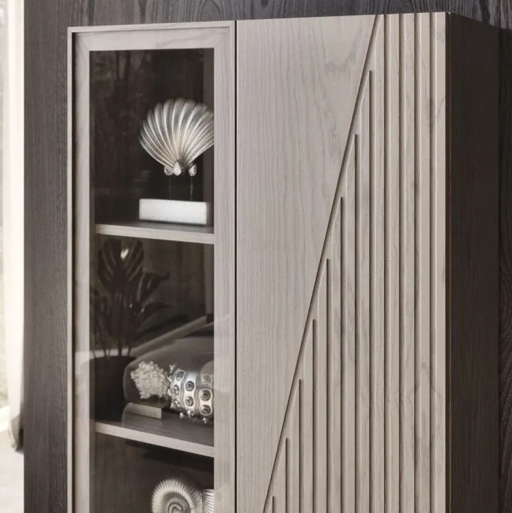 Vetrina in stile moderno realizzata in legno di frassino, a 3 ante .Due ante laterali sono a vetro e l’anta centrale in legno decorata con linee verticali al laser. Internamente i vani i sono suddivisi da ripiani in legno e le aperture sono ammortizzate con cerniere blum.