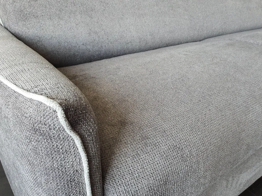 Il rivestimento in tessuto è completamente sfoderabile di colore grigio con filetto a contrasto bianco lungo tutto il perimetro del divano.