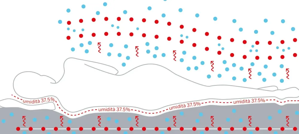 Regula 37.5, grazie alla sua tecnologia, ti riscalda quando hai freddo e raffredda quando hai caldo: è l’effetto dell’azione svolta dalle particelle di minerali attive che, allontanando dal materasso il sudore prima che diventi liquido, regolano costantemente temperatura e umidità a contatto con la pelle al 37.5% e creano il microclima ideale per il sonno.
